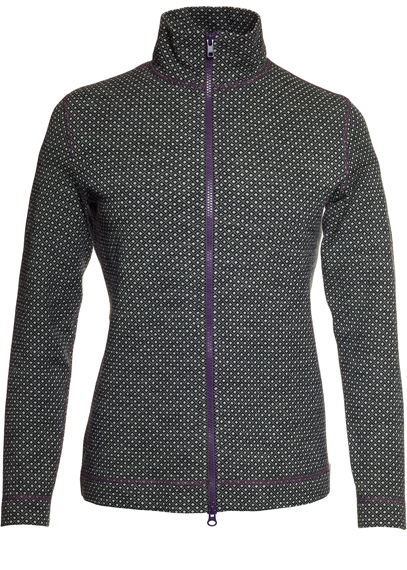 Varm och skön kofta i 82% fin merinoull och 18% polyester. Mellanlång modell med blixtlås ståkrage. Lila blixtlås och sömmar. Mycket tunnare än vår filtade ull, något kraftigare än vår tunna ull. Längd på blixtlås 65 cm.