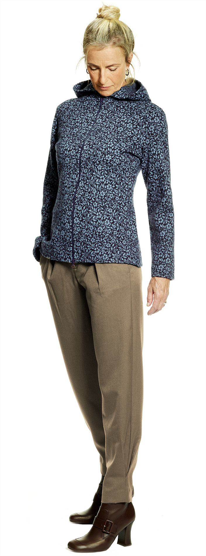 Tröja/jacka med tvåvägs blixtlås. Mellanlång modell med rund luva i 100% filtad merinoull. Användbar året runt; inomhus på vintern för den frusne, som ytterplagg vår och höst och lagom för en sval sommarkväll. Lita aldrig på skärmen när det gäller färg. Beställ gärna ett tygprov först.