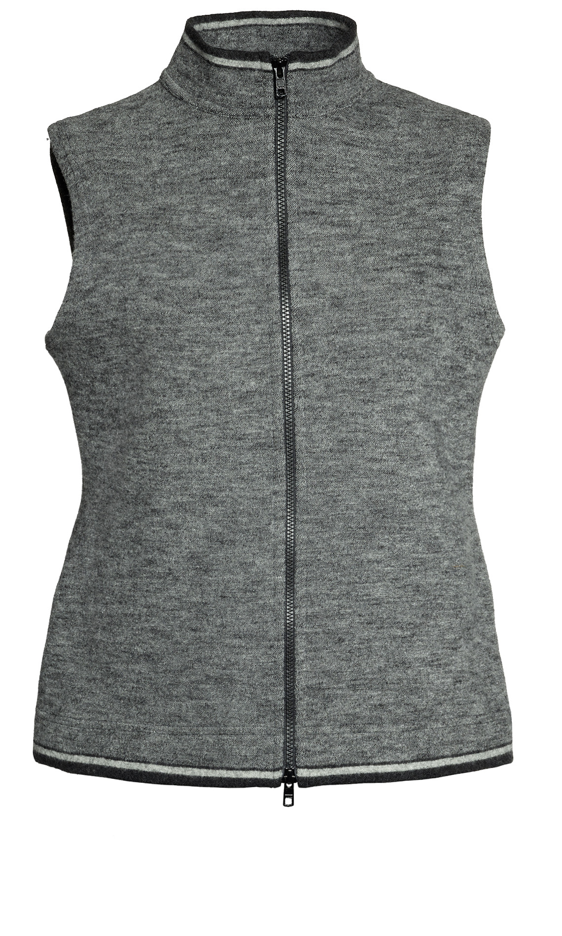 Väst med tvåvägs blixtlås. Mellanlång modell med 7 cm.krage i 100% filtad merinoull. Blixtlåsets längd är 55 cm.